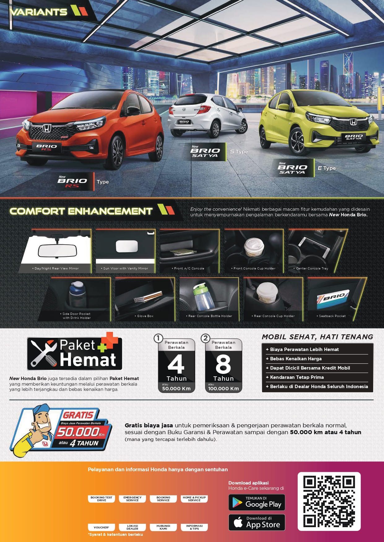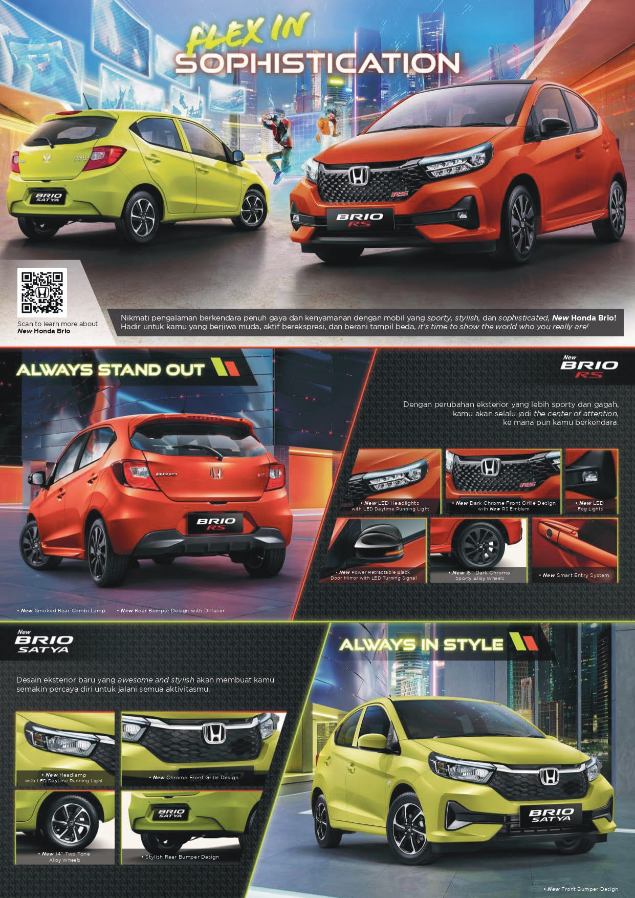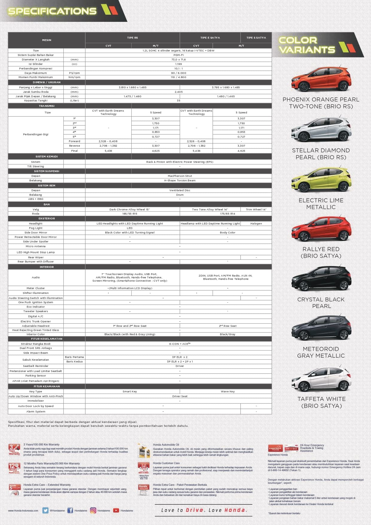 Honda Brio tersedia dalam 8 warna yang berbeda - Crystal Black Pearl, Modern Steel Metallic, Rallye Red, Lunar Silver Metallic, Taffeta White, Phoenix Orange Pearl, Carnival Yellow.